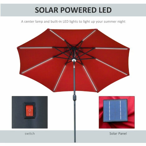 Glow by day, glow by night. This LED light parasol from Outsunny is a special design which can be used from sunrise, to sunset and beyond. It features solar-powered light panels on the support ribs and a central lamp, which are controllable via the attached switch. The canopy can be moved left and right, setting to a 45° angle both ways, keeping you protected when the sun shines in different directions. It’s attached to an aluminium pole so the parasol umbrella with lights stands upright and is suitable for outdoor use.
