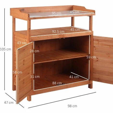 This wooden potting bench from Outsunny has a simple appearance yet flexible functionality to bring an awesome addition to your garden or backyard. The garden potting bench has a workstation table, ideal for storing various tools and accessories and as a garden potting table. The metal tabletop is very easy to clean, you could feel free to do the work on it. The outdoor potting table is made of fir wood which is durable and sturdy, and offers long-term reliable use.