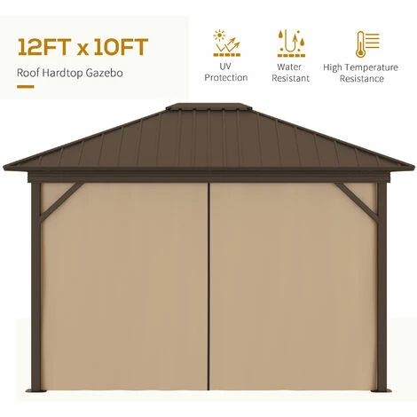 Step up your garden party game with this hard top gazebo from Outsunny. This permanent gazebo has strong powder coated aluminium frame, paired with the hardtop roof make it a firm impression – one which will create a safe and steady shelter for all you want in your outdoor areas. The garden gazebo is fitted with four curtains to enclose when needed – inner mesh curtains help keep annoying insects away. Set is complete with ground pegs and expansion screws to pin and secure to the ground.