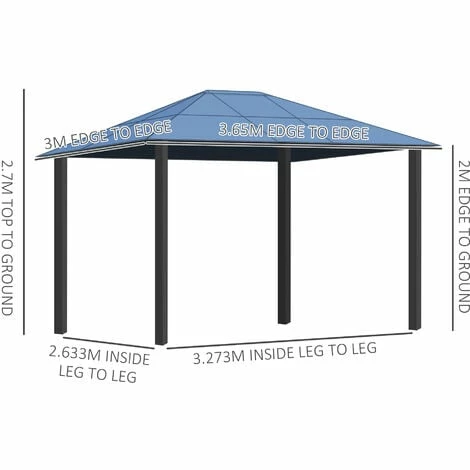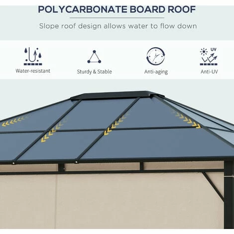 Add an elegant touch to any outdoor space with this Outsunny garden gazebo, a perfect sun shelter for any occasion! The polycarbonate roof is UV protection. Selected steel for the frame makes it sturdy, formed into a spacious 3.6 x 3(m) size – you can host plenty of people at once. Curtains create privacy and shield you from annoying bugs and more. Life is meant to be enjoyed outdoors, so enjoy this permanent gazebo in your own backyard space.