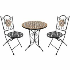 Add a quirky touch to your outdoor dining area with this garden bistro set for 2 from Outsunny. It includes a round side table covered in a beautiful and unique mosaic tile design with two matching and foldable chairs to complete. Each piece of this folding garden furniture is built on a solid reinforced metal frame to ensure strength and stability. Our metal garden furniture set is the perfect set for relaxing with a friend in your garden, patio, conservatory or balcony.