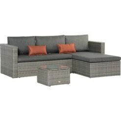 This Outsunny outdoor corner sofa makes your garden just as inviting as the inside. Powder coated steel frames mean tough pieces, wrapped with plastic wicker for a rattan-ready look – in light grey for versatile style. Padded seat and back cushions of the small garden furniture keep you comfortable. Matching coffee table of the grey rattan sofa set with glass top for a solid handy holding place. An inviting conservatory furniture set for your garden.