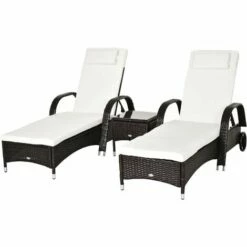 The rattan patio chaise lounge set from Outsunny comes complete with 2 loungers, 1 side table and cushions. The seat has 5 adjustable positions to give maximum relaxation and comfort. The side table also has a glass top to keep your drinks at easy reach, and the set can be used indoors and outdoors.