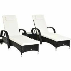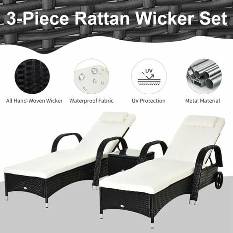 The rattan patio chaise lounge set from Outsunny comes complete with 2 loungers, 1 side table and cushions. The seat has 5 adjustable positions to give maximum relaxation and comfort. The side table also has a glass top to keep your drinks at easy reach, and the set can be used indoors and outdoors.