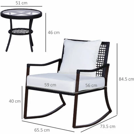 This Outsunny rocking chair set is an ideal addition to your outdoor garden patio. The set consists of 2 rocking chairs and a coffee table with tempered glass. Made from a steel frame and covered with PE rattan to match any indoor or outdoor décor. The set comes complete with 8cm padded cushions for your comfort. Kick back, relax, and enjoy the smooth rocking glide while indulging yourself in your outdoor space.
