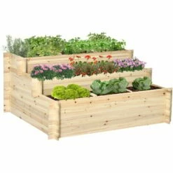 The raised garden table from Outsunny will add vitality to your space. The design of 3 tiers and 9 compartments can give you enough room and separate space is better for plants with different growth cycles. The gradually elevated design takes full account of all kinds of root lengths and sizes. Built of 100% fir, the plant box is stable and durable. The polished surface and black non-woven fabric protect it well. Simple and rustic style is suitable for garden, balcony, lawn, or yards!