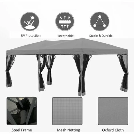 Grab your favourite drink and enjoy the shade of freedom with this Outsunny 3m x 6m gazebo with sides. The sturdy frame adds a durable place for you to relax in the shade. This garden shelter is perfect for any occasion such as family gatherings, picnics, camping or tailgates. The mesh sidewalls make it great for keeping comfortable in, and you can enjoy the outdoors even if the sun goes down. Save time to set up, you will have more time to enjoy yourself with stylish Outsunny pop up gazebo.