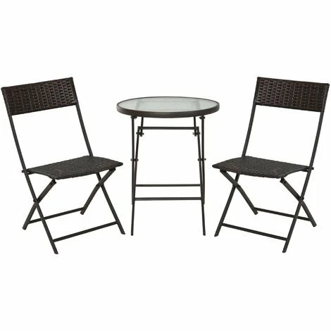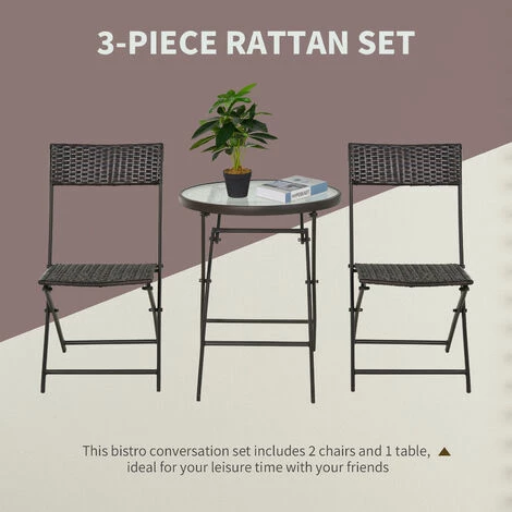 This 3-piece rattan bistro coffee set from Outsunny is an ideal solution for your garden, patio or balcony. Made with quality steel tubing and covered with PE rattan, it will last for years to come. The set consists of 1 table and 2 chairs, a suitable addition to any home with limited space. The whole set can be easily folded and stored away to create more space when not in use. Enjoy the day drinking coffee and reading your favorite book at your very own rattan garden furniture set.