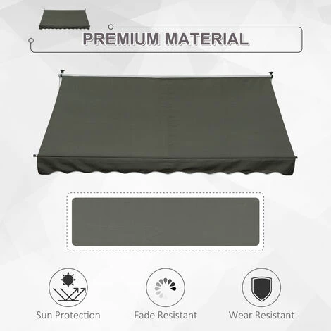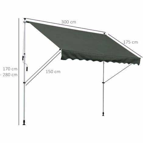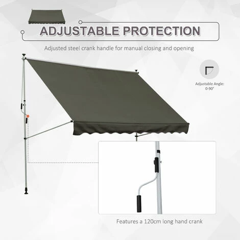 Bring shelter into your outdoor garden space when needed with this 300cm x 150cm retractable awning from Outsunny. The powder-coated aluminium frame ensures it is tough and durable for long-term use in your home. Manually operated via the crank handle, the garden awning angle can be adjusted between 0 – 90 degrees, allowing you to easily set it to a position which suits you, with the weather-resistant canopy shielding you from UV rays, the sun glare and light wind and rain.