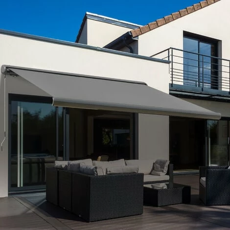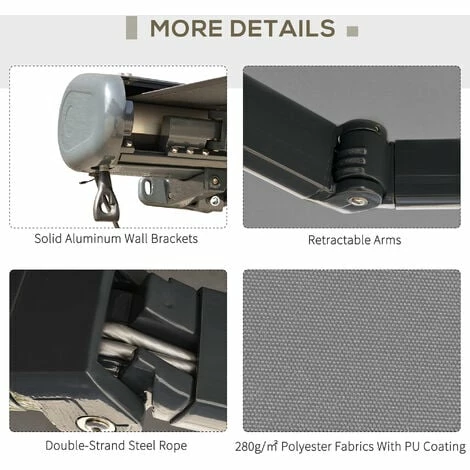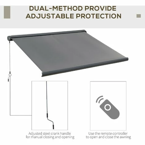 Create shade over your doorways and windows at the touch of a remote – grab this electric awning from Outsunny. Using an aluminium and steel blend frame, the main structure is solid and tough, making it suitable for outdoor use. The thick 280g/m² canopy is coated with PVC on the top for protection against UV and sun glare without fading the colour: it will keeping looking beautifully new throughout the seasons. Handle for manual operation included. Fixes to cement walls, remote control included.