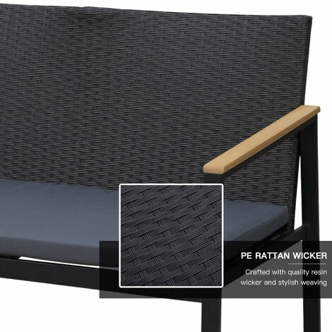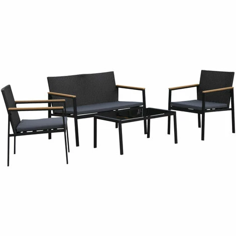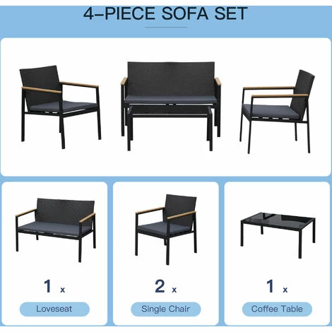 • includes two wide chairs, a two-seat sofa and large coffee table • Matte black metal frame with dark grey PE rattan panels, a muted and stripped back look