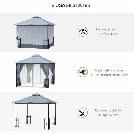 This 4 x 3.35m canopy tent from Outsunny is a great way to upgrade your outdoor space with elegance. A steel frame for a strong, steady structure – size is spacious enough for hosting plenty of people at once. Curtains to create privacy, with removable netting to protect from bugs. They can be held back when you want an open party. Comes complete with ground nails and guy ropes to fix the patio cover.