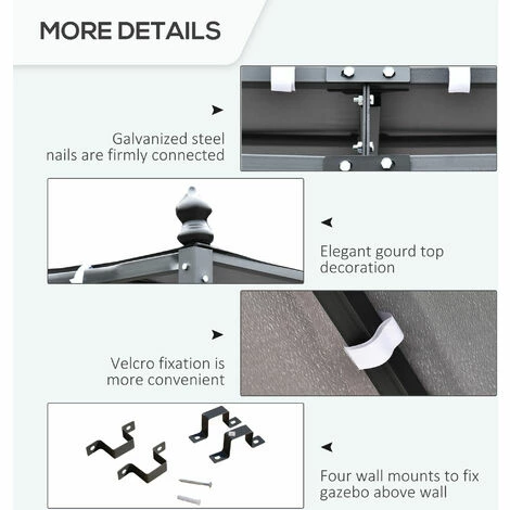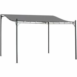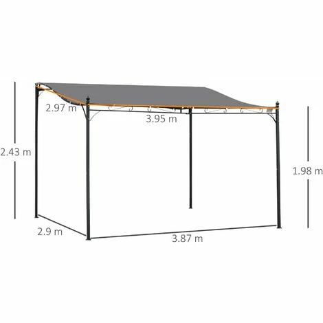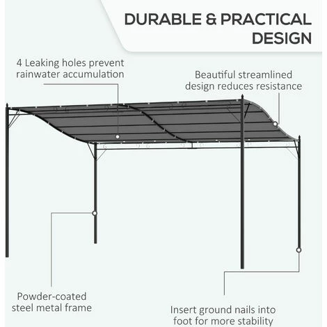 Give yourself a spot to take shade and shelter outdoors with this lean to pergola from Outsunny. It is crafted into a 243 x 395cm design, consisting of a taller back and short front, with a waved connecting frame covered with a top 180gsm polyester canopy, providing shelter against direct sunlight. With an elegant scroll design on the front, the wall mounted canopy is finished with eight drainage holes on the top to prevent water accumulation and with eight ground stakes to pin to the ground.