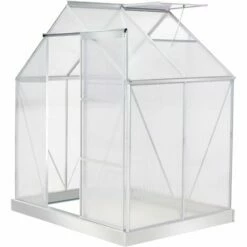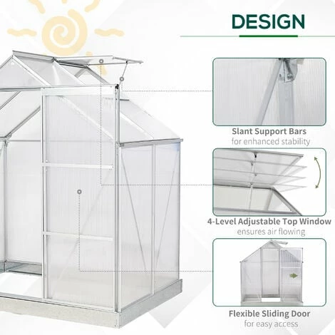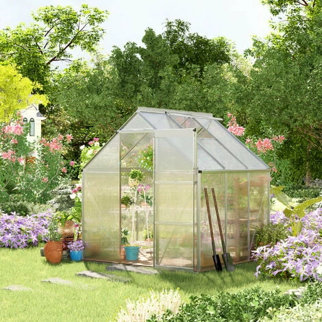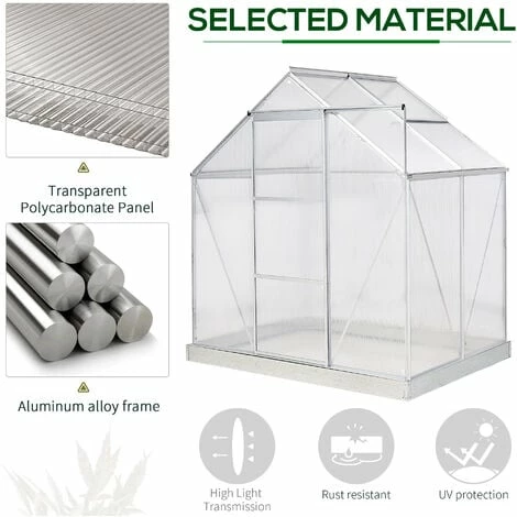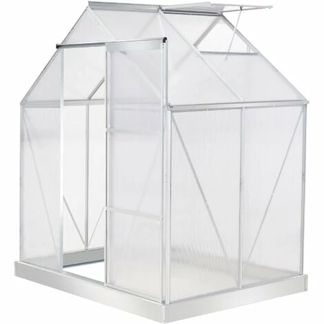 Let your plants grow heartily with this outdoor greenhouse from Outsunny. Inner area provides plenty of growing room, with an aluminium frame keeping the structure upright and in place, surrounded with durable polycarbonate panels, which protects from rain and harsh sunlight. A sliding front door provides easy access, with a small window for ventilation inside when needed. Galvanised steel base for extra strength.
