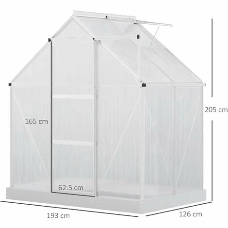 • Dimensions: 193L x 126W x 205Hcm. Door: 165H x 62.5Wcm. Window: 58L x 51W cm. Foundation: 11.7Hcm. Panels: 4Dmm. • Panels UV rating: 30um