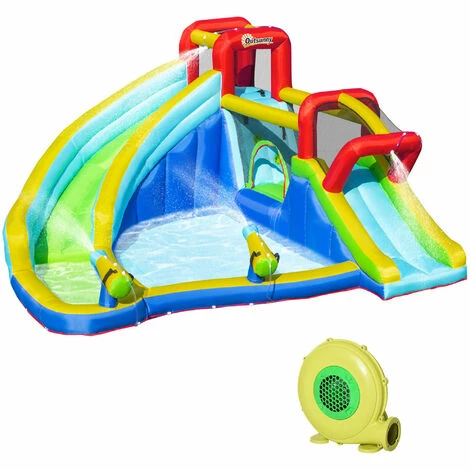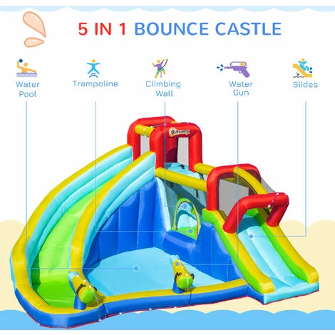 With a great layout and fun design, our Outsunny bounce house will be the talk of all the kids in the neighborhood! Bring the fun of the fair home with you. We made the layout of the bouncy castle varied for the most fun: a trampoline, slide, pool area, water guns and climbing wall all allow kids to go wild and burn some energy. We made sure to include ground stakes, too, so your new bouncy house for kids has no risk in the wind. Check out this inflatable castle and jump into the fun!