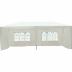 This marquee gazebo with sides is a great item to shelter when entertaining guests. It’s formed of a steel frame for a tough structure, with a durable plastic canopy roof and side shell – there is no front for an open feeling. Six guy ropes and 12 ground pegs are included to make the party gazebo pin to the ground for extra stability. For many events like BBQS, family parties, wedding receptions, BBQs and more. Finished with handy adjustable feet.