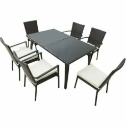• Seven-piece outdoor dining set formed of four chairs with arms, two chairs without arms and a large dining table