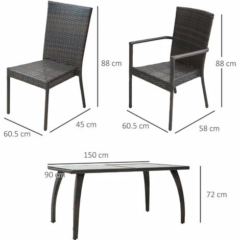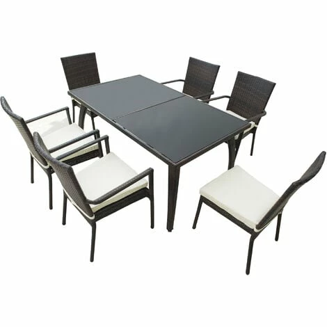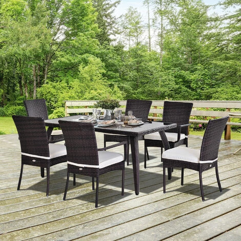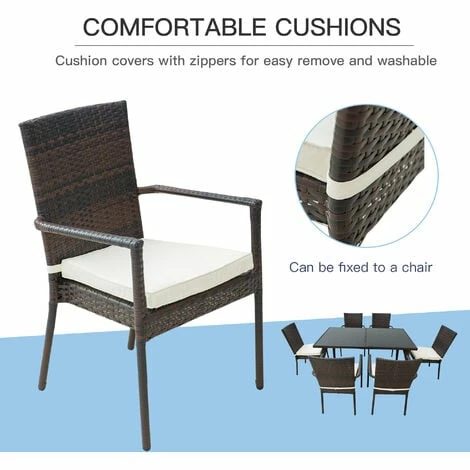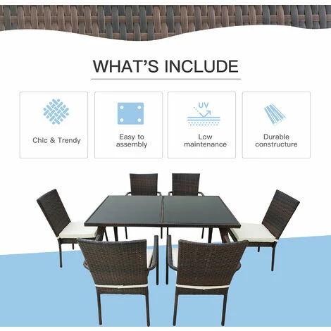 Create a casual dining area on your patio or deck with this 7 pieces garden dining furniture from Outsunny. This brown rattan corner sofa dining set is fashioned from a beautiful wicker material and reinforced galvanized steel frame. The mildew resistant wicker and detachable cushions of the outdoor dining table and chairs allow for easy cleaning and maintenance. The beautifully designed wicker dining furniture set will bring instant contemporary charm and elegance to your dining or sun room.