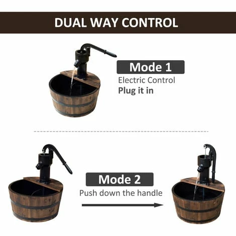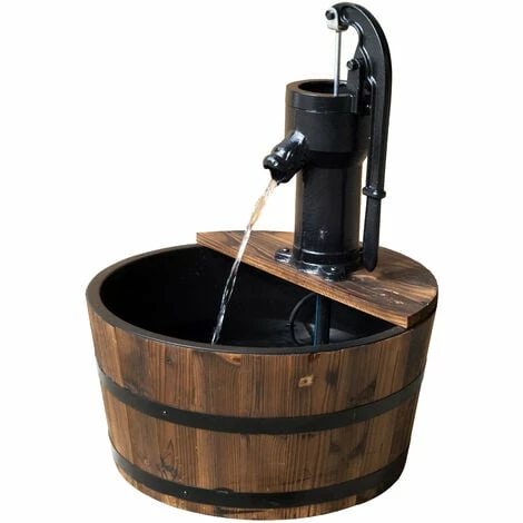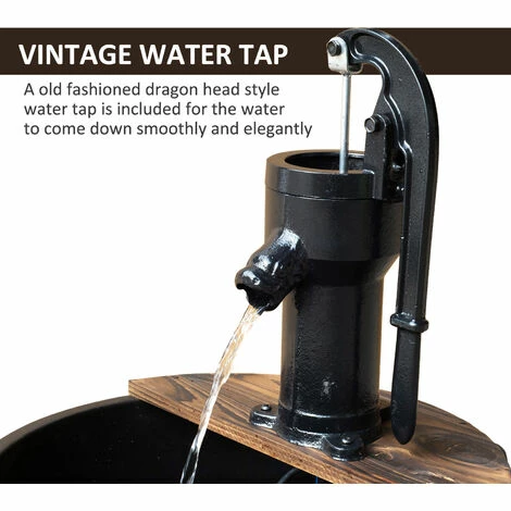 • Rustic wooden barrel design with a metal pump adds a touch of country charm to your patio, garden, or yard.