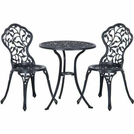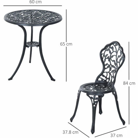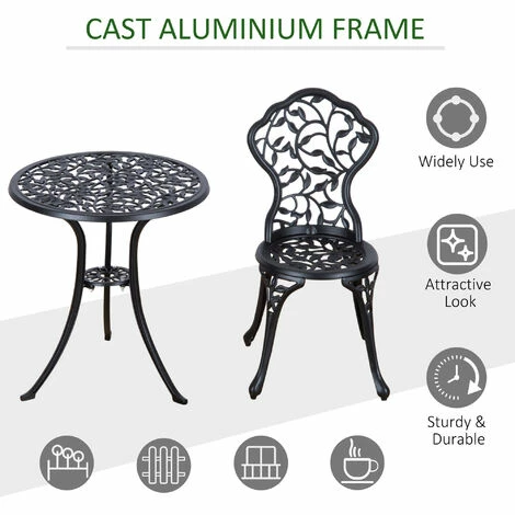 This Outsunny outdoor bistro set is a great addition to any garden or patio, made with cast aluminum, and finished with a leaf design. The set comes complete with two chairs and a table ideal for any garden. This set is designed with the ability to be also used in balconies and porches with limited space. A great inviting piece of furniture for any garden, Patio and more.