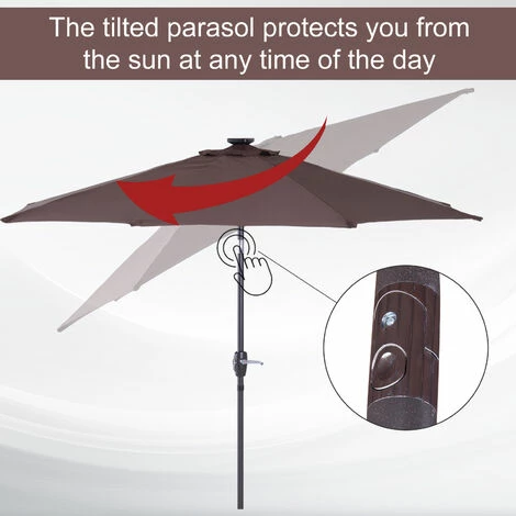 This Outsunny parasol umbrella with lights is a perfect choice to give shade on those sunny days, the deck parasol has the ability to tilt for better protection. It is suitable for your patio, garden, and can be used with existing garden furniture. The steel structure and polyester fabric give support and long-lasting features. The garden umbrella parasol is with solar-powered Led lights with adjustable 4 colours. So when it gets dark you can still continue enjoying the outdoors.