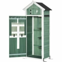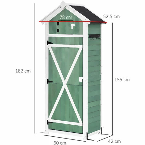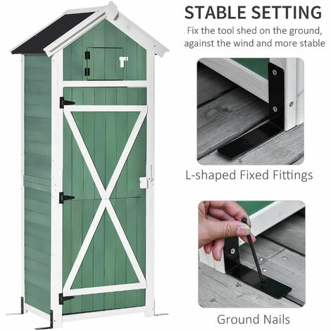 Reclaim garden space with this tall and narrow vertical storage shed from Outsunny. This tool cabinet is covered with a coat of protective paint, which helps protect the structure from light weather damage. A sloped roof prevents water build-up, with asphalt covering so liquid doesn’t seep through. It’s finished with a lockable door making it secure. Equipped with a folding workstation for convenience. L-shaped fixed fittings and ground nails can fix it on the ground, make it more stable.