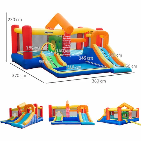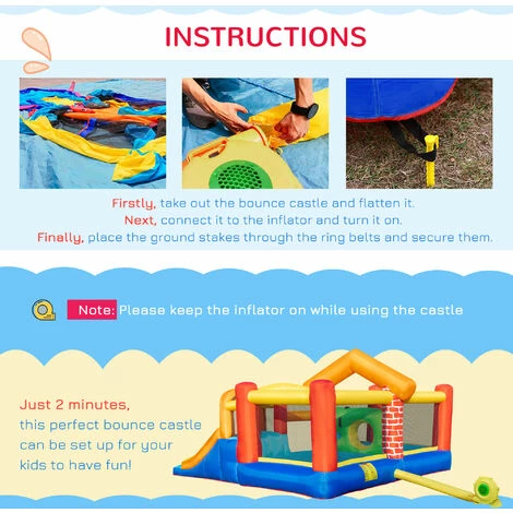 With a great layout and fun design, our Outsunny bounce house will be the talk of all the kids in the neighborhood! Bring the fun of the fair home with you. We made the layout of the bouncy castle varied for the most fun: we have plenty of activity areas that all allow kids to go wild and burn some energy. We made sure to include ground stakes, too, so your new bouncy house for kids has no risk in the wind. Check out this inflatable castle and jump into the fun!
