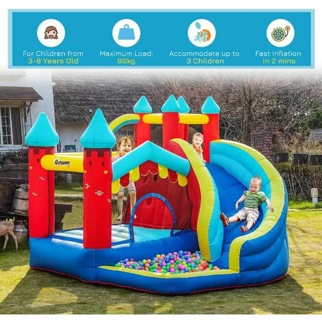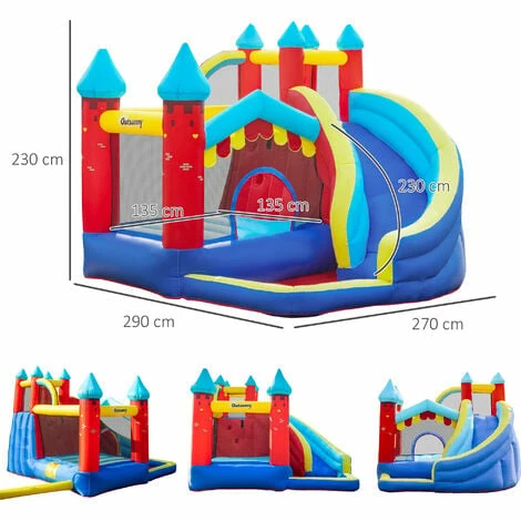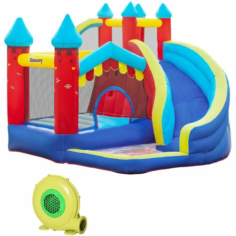 With a great layout and fun design, our Outsunny bounce house will be the talk of all the kids in the neighborhood! Bring the fun of the fair home with you. We made the layout of the bouncy castle varied for the most fun: a trampoline, slide, pool area and climbing wall all allow kids to go wild and burn some energy. We made sure to include ground stakes, too, so your new bouncy house for kids has no risk in the wind. Check out this inflatable castle and jump into the fun!
