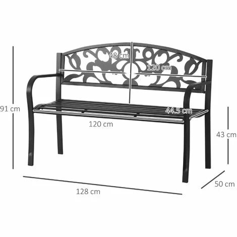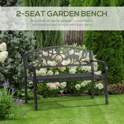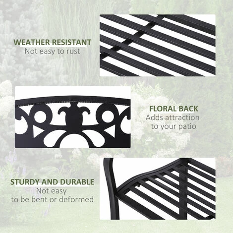 Sit, relax and rest outdoors in style with this outside bench from Outsunny. Made from high quality and durable metal, the backrest has been crafted into a beautiful and elegant floral scroll design which works wonderfully in all outdoor spaces. The garden bench seat’s metal construction make it build to last and black bench is finished with two wide arm rests for comfort. And our 2 seater benches are perfect for taking some time out, reading a book in the sun or simply socialising with friends.
