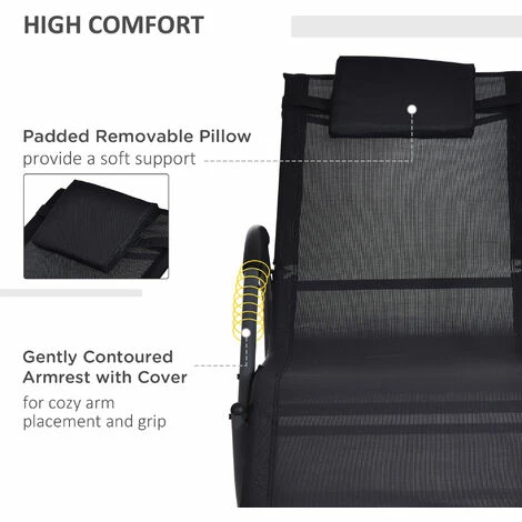 Designed with complete relaxation in mind, this rocking sun lounger is ideal for enjoying the sun in your garden, on your balcony and wherever else possible. Made from lightweight but sturdy metal which can handle up to 160kg, the frame is crafted into a unique design which will let you rock forwards and backwards smoothly and gently, with a tough and durable texteline sling covering the whole of the waved seat for maximum comfort, as well as allowing your skin to breathe in hotter temperatures. With pads on the upper of the armrests so your skin doesn’t touch the metal when It’s hot, this lounger is completed with a removable pillow for head support and comfort if wanted.