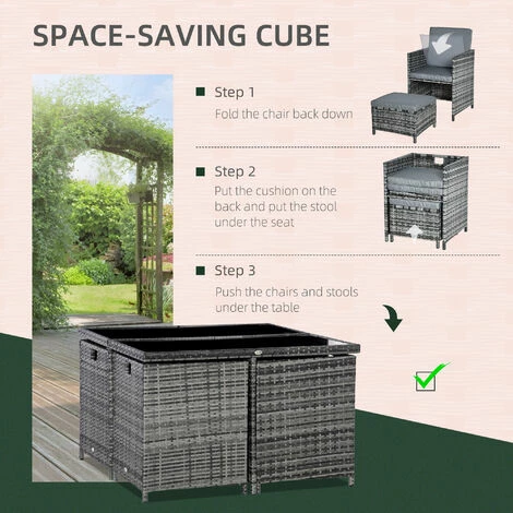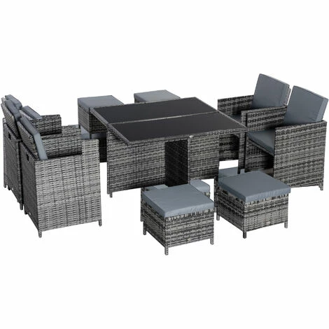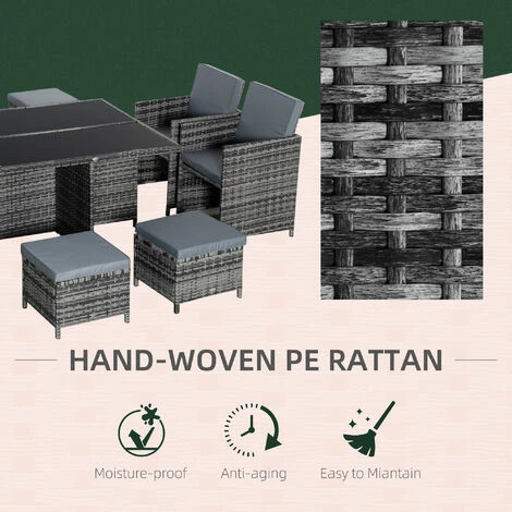 The Outsunny 9-piece rattan table and chairs with cushions are suitable for any occasion. The elegant rattan corner sofa dining set includes 1 table, 4 armchairs and 4 footrests made of aluminium frame and PE rattan. The wicker and tempered glass table combination of the rattan corner sofa dining set looks fashionable and create a modern style for your living area. The corner rattan dining set will complement various outdoor spaces for you.