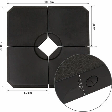 • Four-piece set, with all pieces slotting together on a cross base for parasols • Filling holes on each side, each piece fills to a maximum of 20kg water or 30kg – making it easy to store and carry when empty
