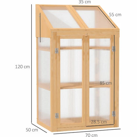 This cold frame greenhouse, from Outsunny, is a great choice to care for your plants. Solid fir wood frame for reliability. Transparent polycarbonate panels allow maximum light transmission, whilst retaining heat for early seed sprouting or for protecting plants late in the season. Features three removable shelves for organising plants. This plant grow house creates an ideal-temperature environment, so plants can grow healthily.