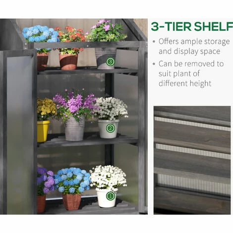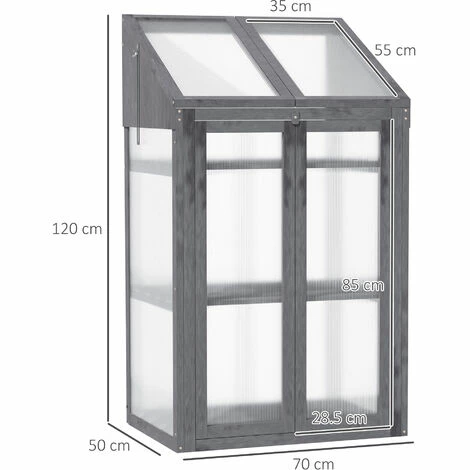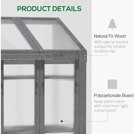 This cold frame greenhouse, from Outsunny, is a great choice to care for your plants. Solid fir wood frame for reliability. Transparent polycarbonate panels allow maximum light transmission, whilst retaining heat for early seed sprouting or for protecting plants late in the season. Features three removable shelves for organising plants. This plant grow house creates an ideal-temperature environment, so plants can grow healthily.